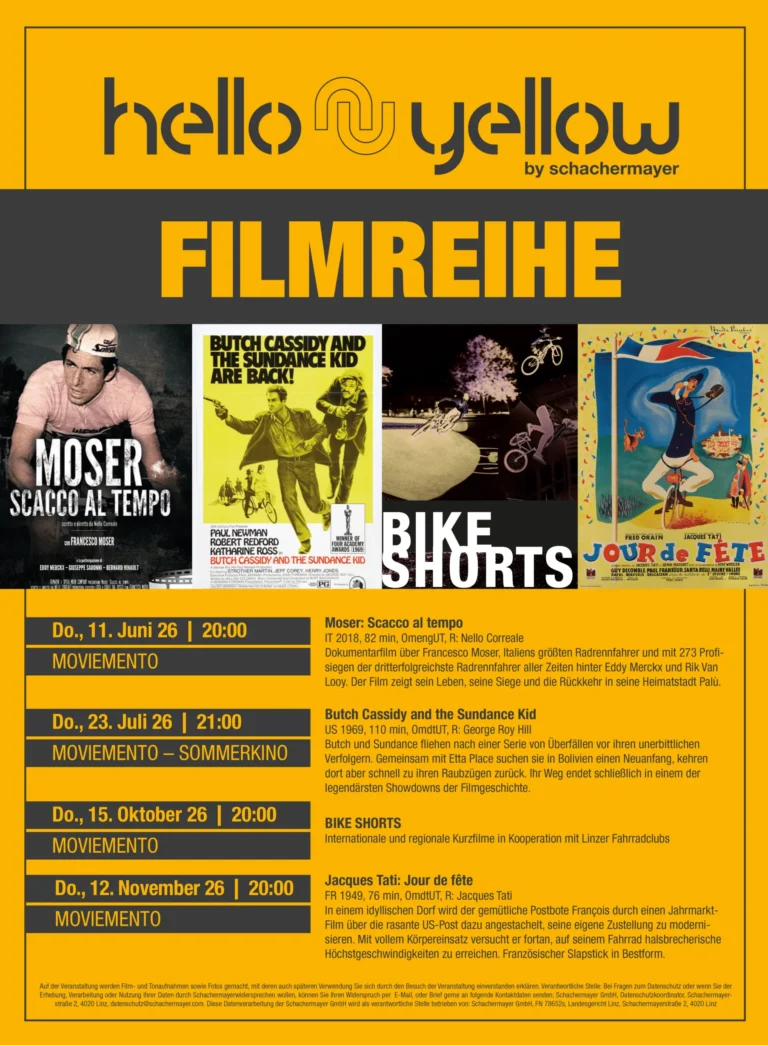 In Kooperation mit dem Moviemento Linz präsentieren wir die 3. hello yellow Filmreihe. Natürlich dreht sich dabei traditionell alles ums Fahrrad! Von faszinierenden Dokumentarfilmen bis hin zu humorvollen Klassikern – das Programm bietet für jeden etwas.